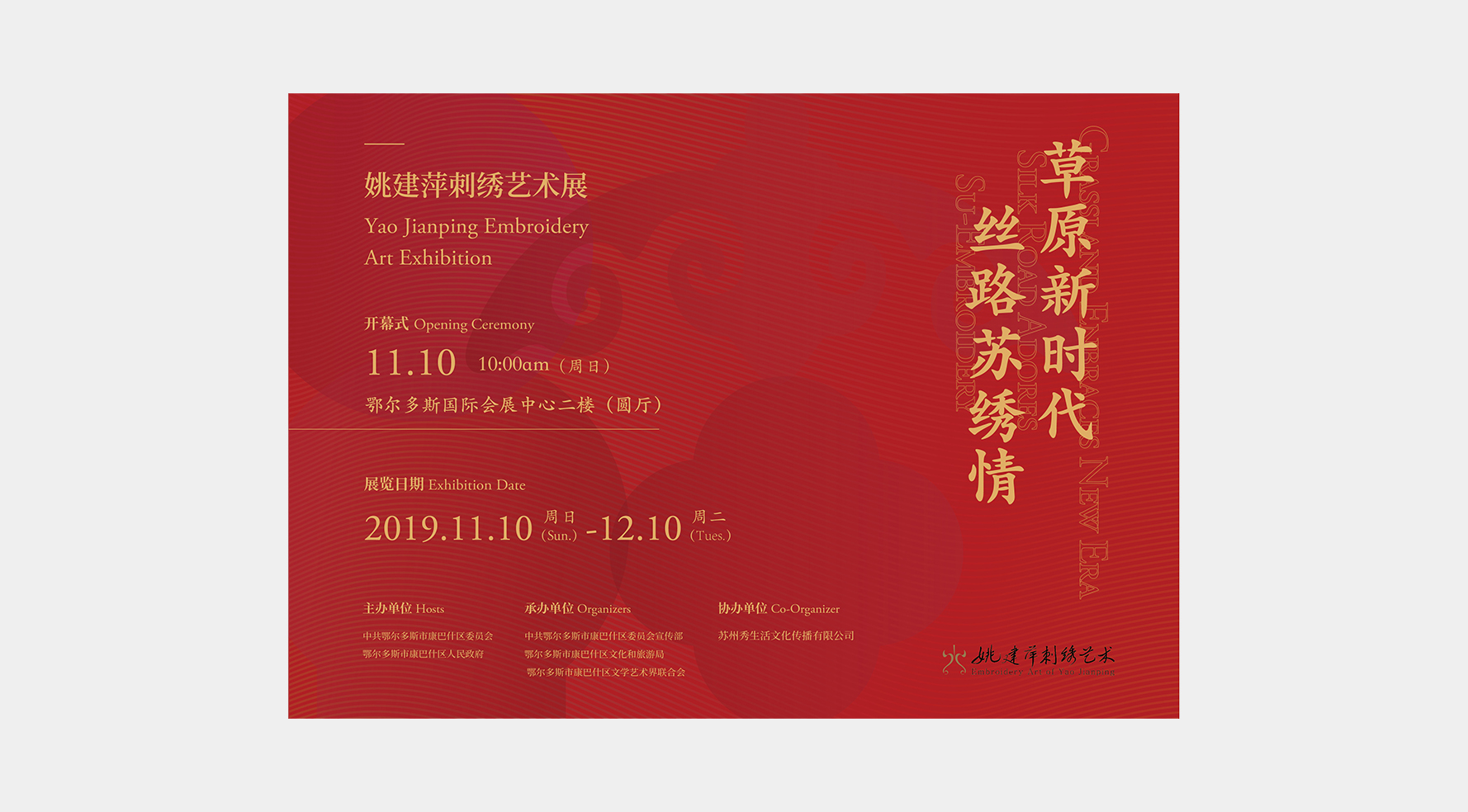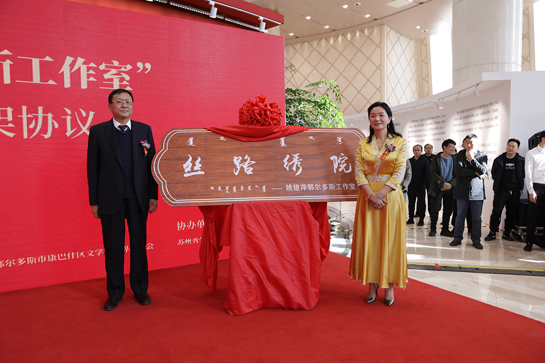 2019年11月10日上午,由中共鄂尔多斯市康巴什区委员会、鄂尔多斯市康巴什区人民政府主办,中共鄂尔多斯市康巴什区委员会宣传部、鄂尔多斯市康巴什区文化和旅游局、鄂尔多斯市康巴什区文学艺术界联合会承办,苏州秀生活文化传播有限公司协办的“草原新时代,丝路苏绣情——姚建萍刺绣艺术展”在内蒙古自治区鄂尔多斯国际会展中心圆厅盛大开幕。