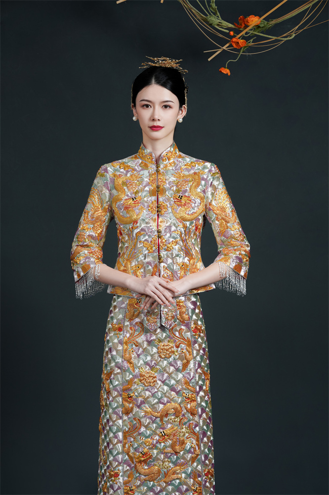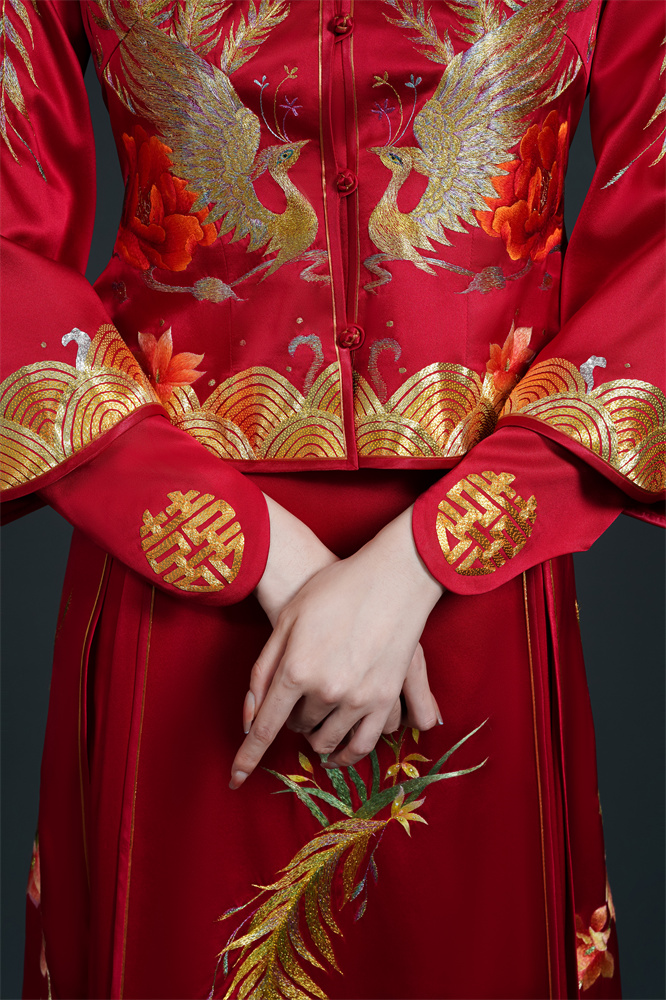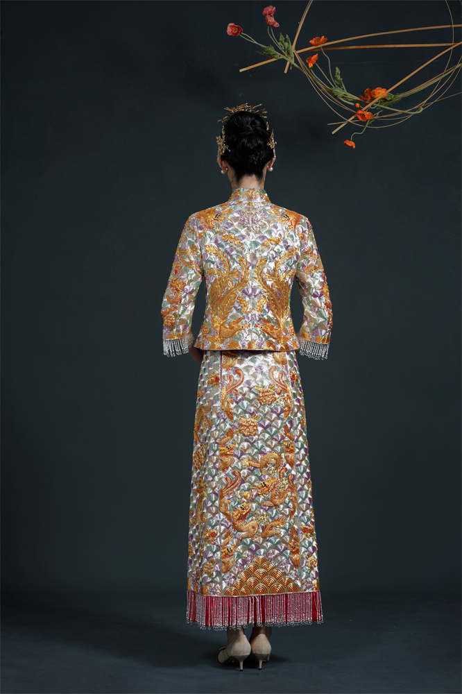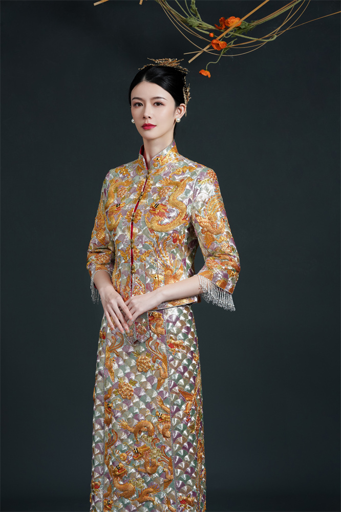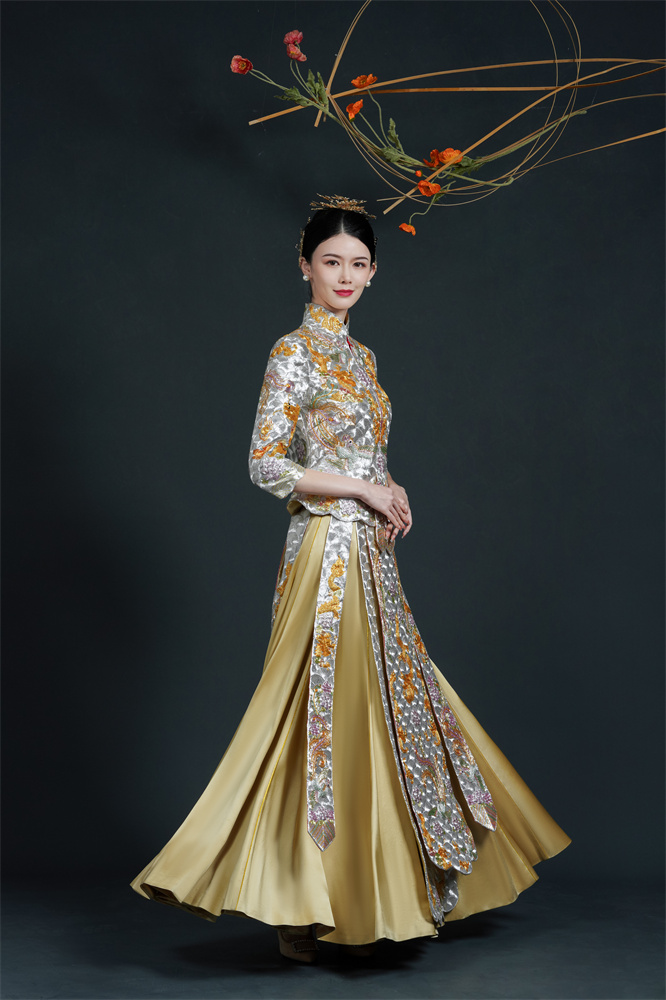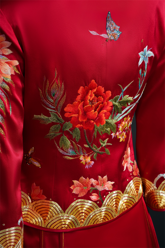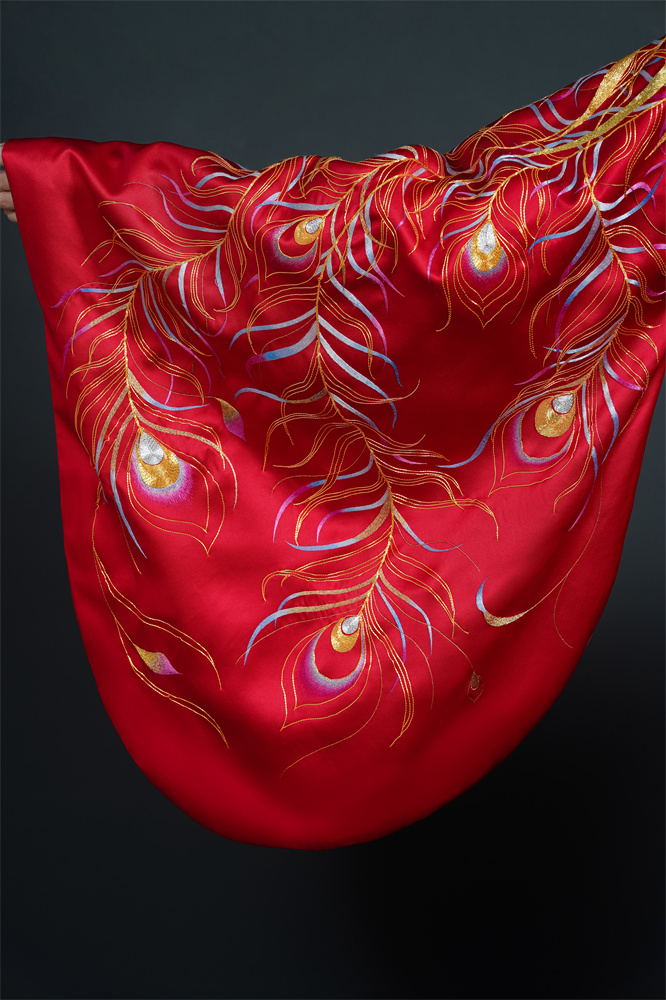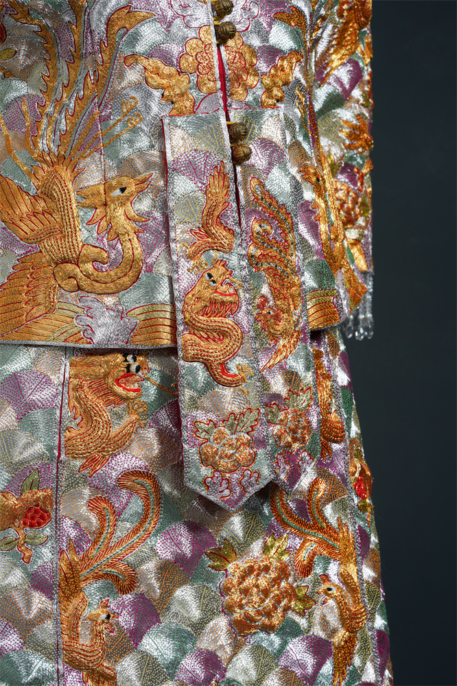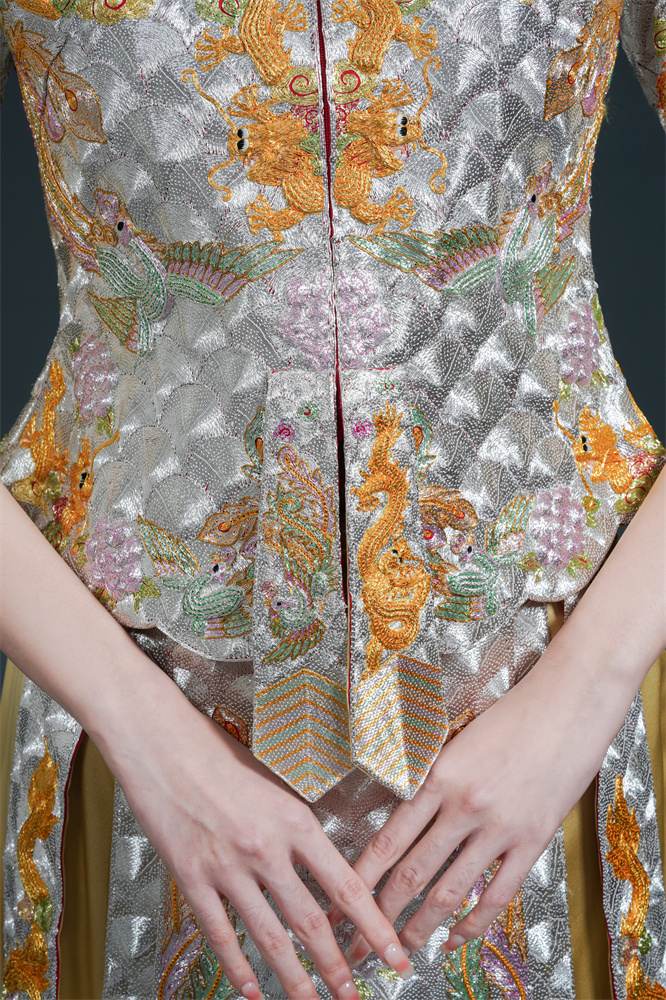 Stitch: Rolling stitch; gold couching embroidery; scattered interlocking stitch; interlocking stitch; bead embroidery