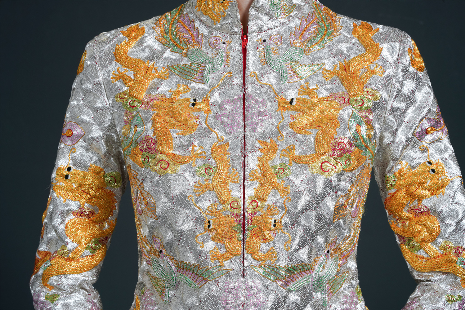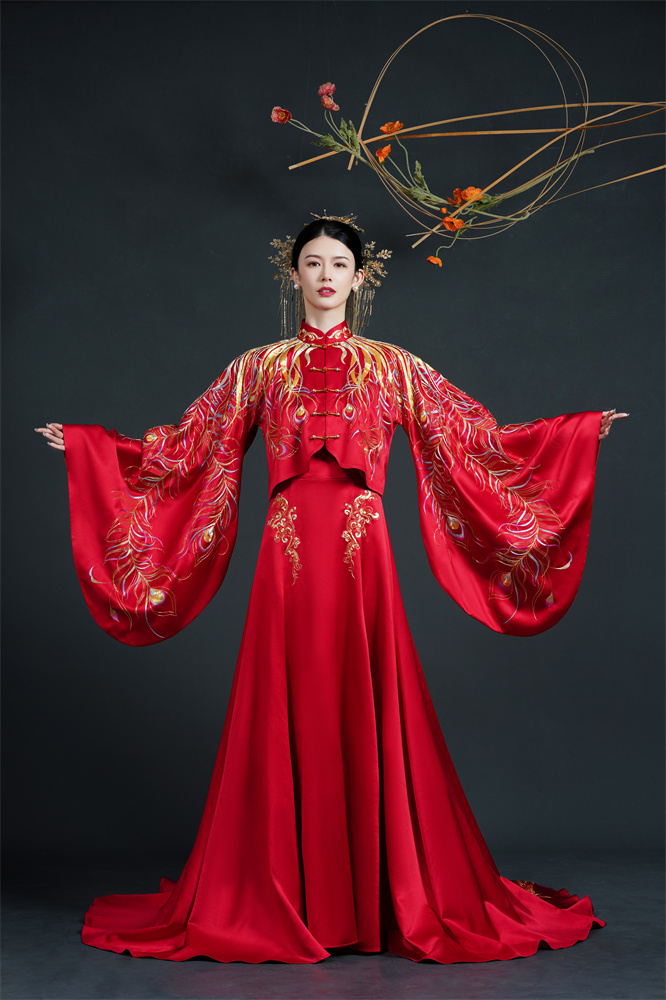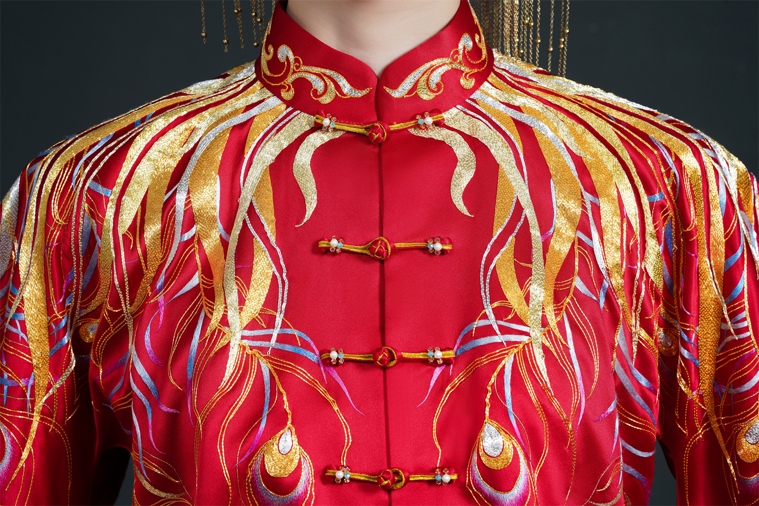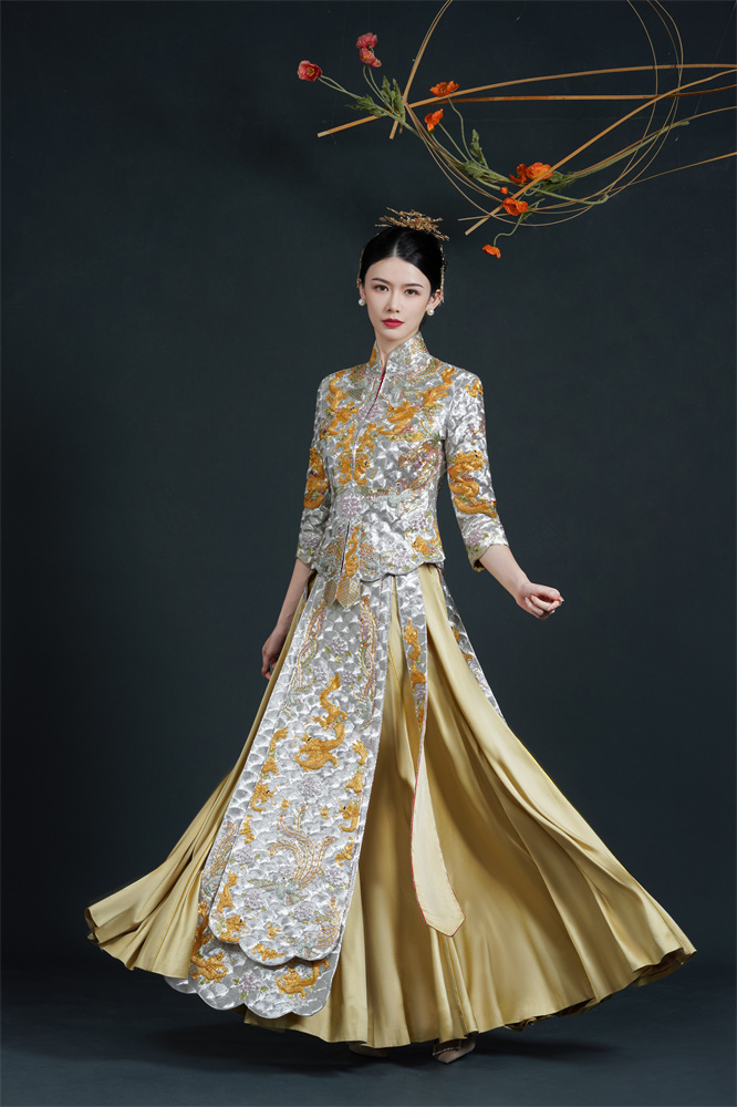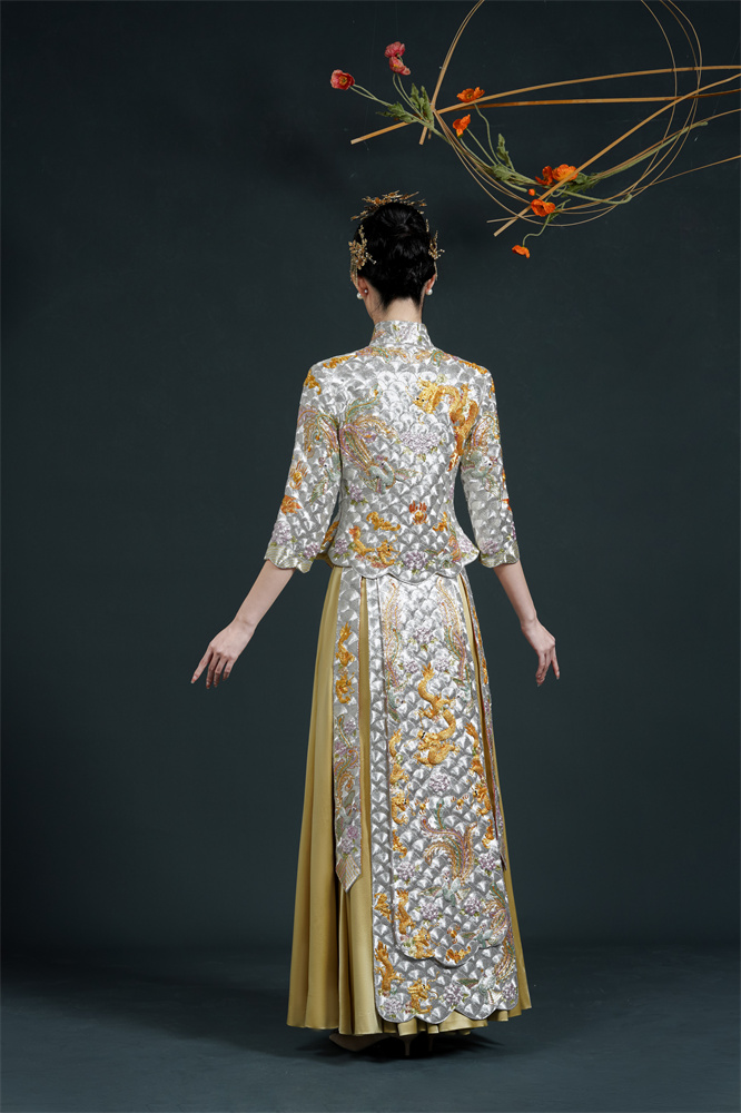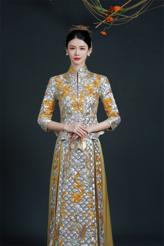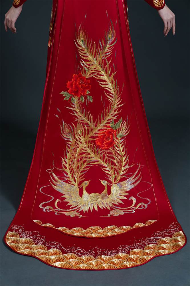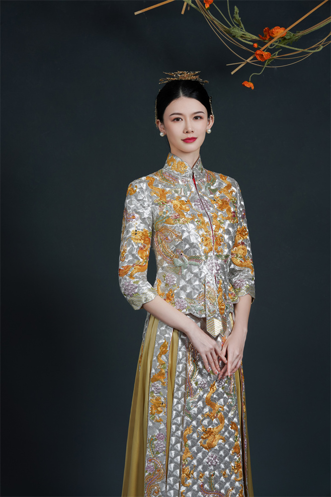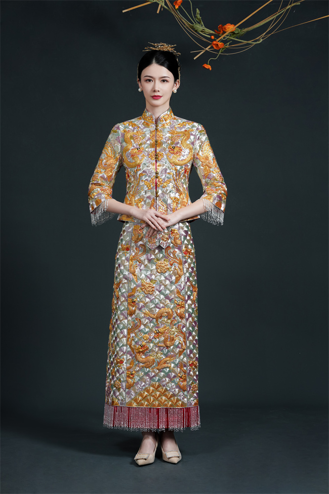 Stitch: Rolling stitch; gold couching embroidery; scattered interlocking stitch; interlocking stitch; bead embroidery