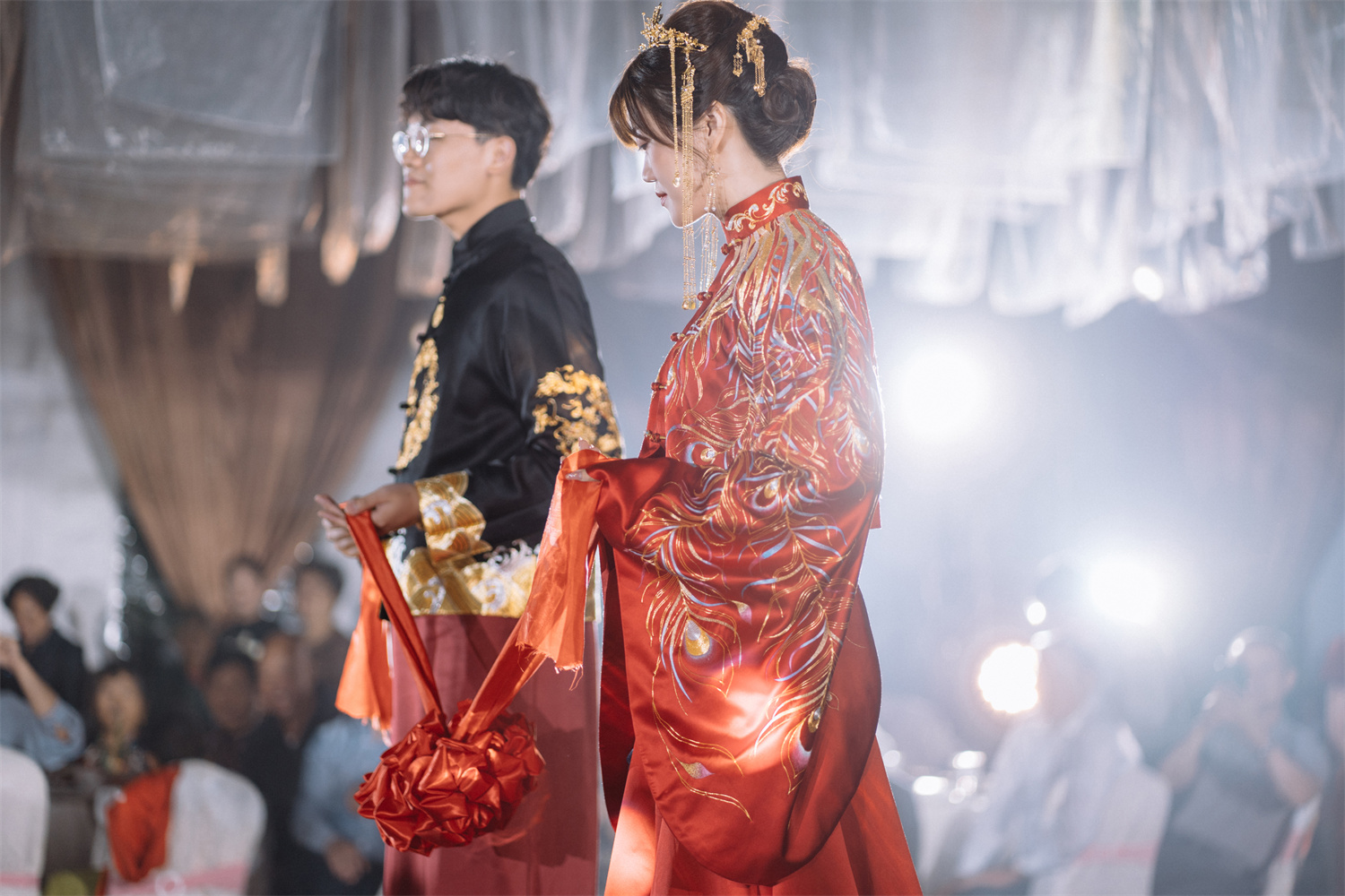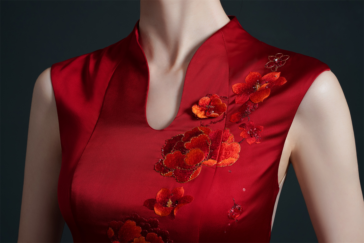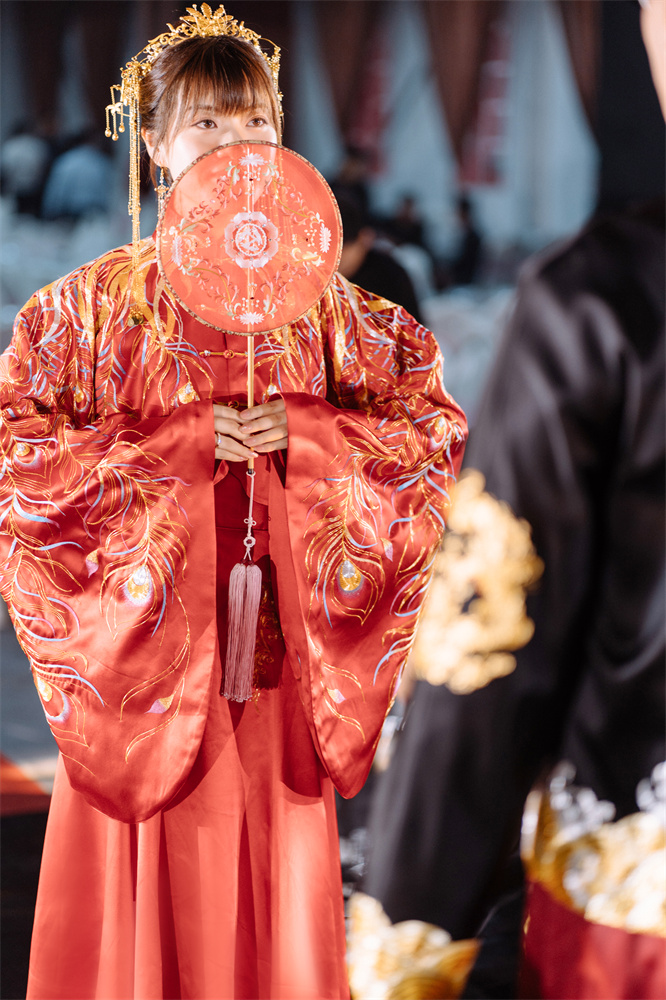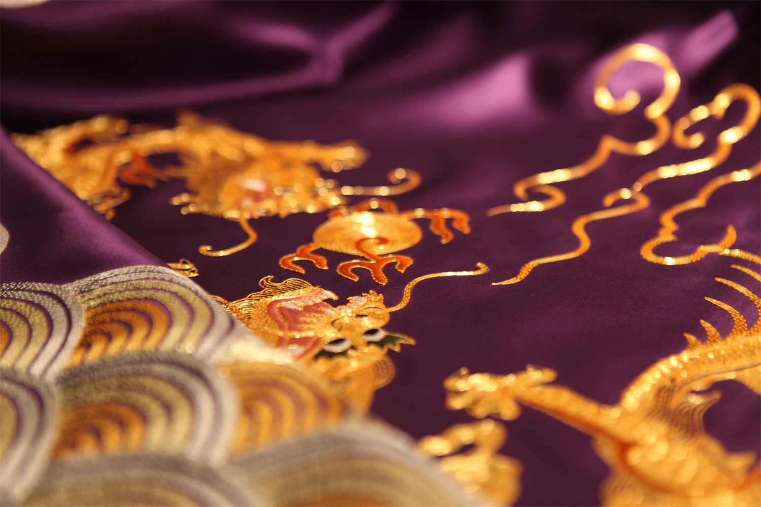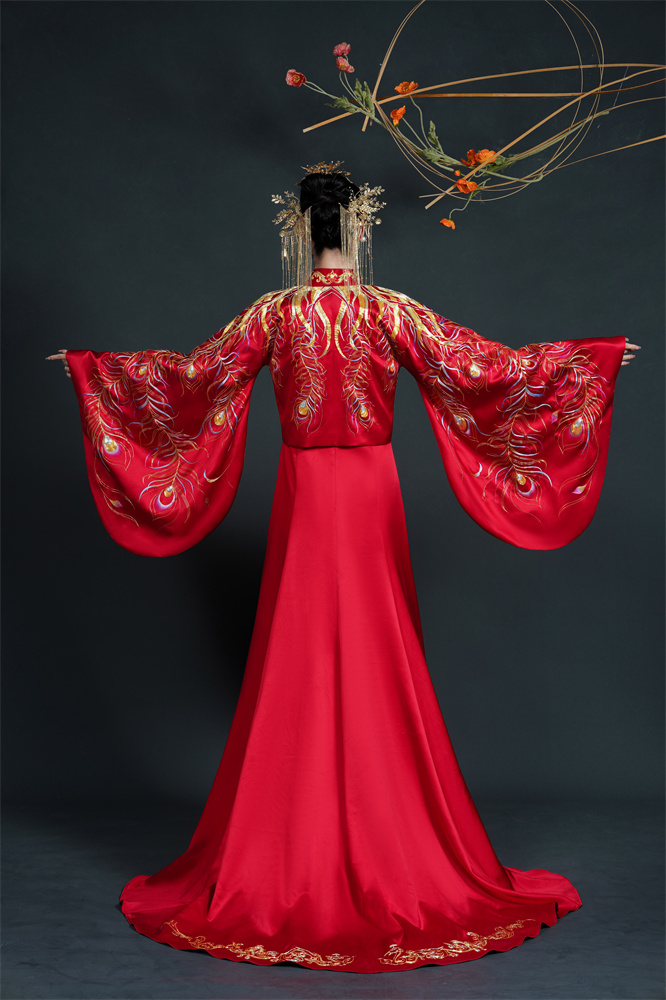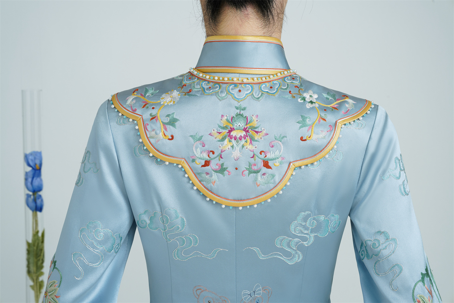 Stitch: Rolling stitch; gold couching embroidery; scattered interlocking stitch; interlocking stitch; bead embroidery